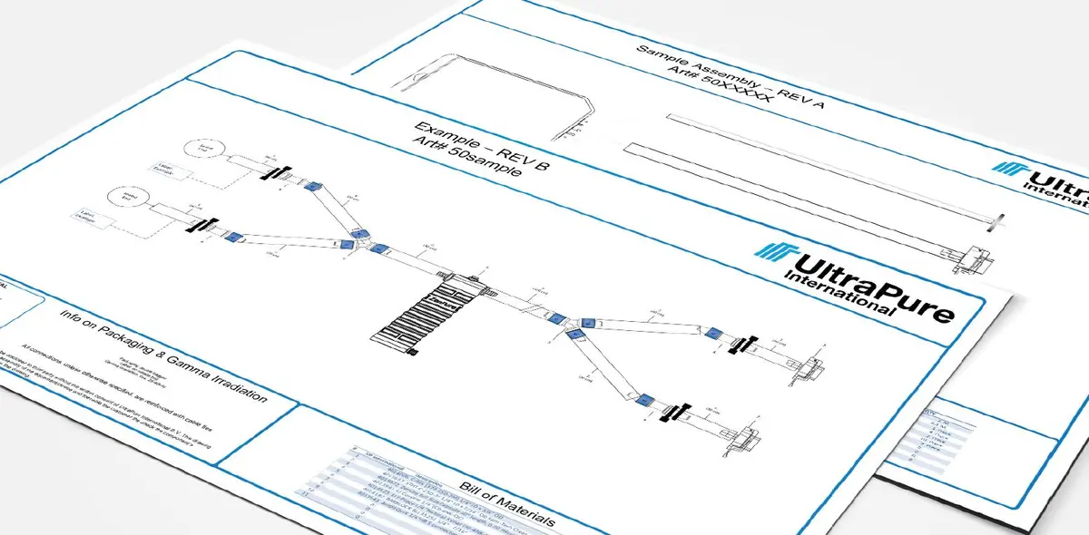The development of a custom single-use assembly begins with a custom design. This is a drawing of the assembly for the specific bioprocess application. Each single-use assembly is customised and uses tubing or reinforced tubing, fittings, couplings, filters, sensors, bottles, bags and other components.